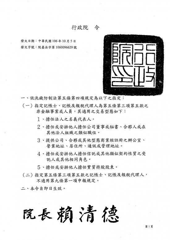 指定記帳士、記帳及報稅代理人為洗錢防制法第5條第3項第5款之非金融事業或人員、其適用之交易型態及不適用第9條第1項申報規定,業經行政院於中華民國106年10月5日以院臺法字第1060096629號令發布,並自即日生效,請查照。