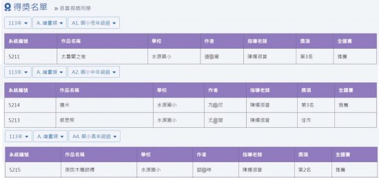 1131014(一)本校四名學生在教導主任陳陽淑曾指導下,榮獲113年全國學生美術比賽花蓮縣縣賽低年級第3名、中年級第3名及佳作、高年級第2名。在本縣高等級的競賽殿堂與市區的孩子們一同競技,能獲獎且在前三名的榮譽實在不簡單。再次恭喜得獎的孩子們,更要感謝花了自主時間長期指導孩子的淑曾主任。