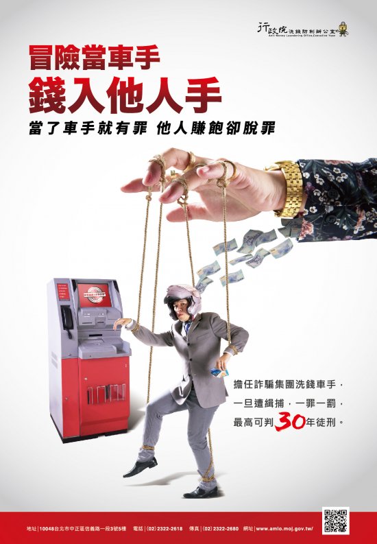 為因應今(107)年11月亞太洗錢防制組織來臺現地評鑑,並持續推動防制洗錢宣導工作,行政院洗錢防制辦公室今年度再推出「傻傻當人頭當成冤大頭」、「客戶詳審查金流有保固」、「冒險當車手錢入他人手」等3款電子海報(PDF檔,如附件),