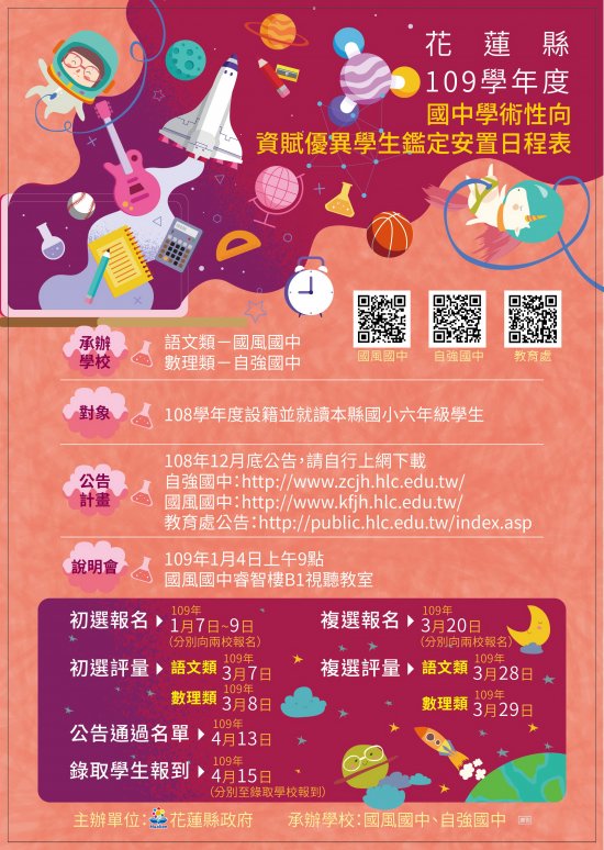 本縣109學年度國小一般智能資優學生鑑定及國中學術性向資優學生鑑定日程