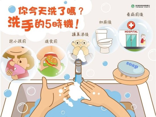 1.抱小孩前、2.進食前、3.擤鼻涕後、4.如廁後、5.看病前後(回家後)