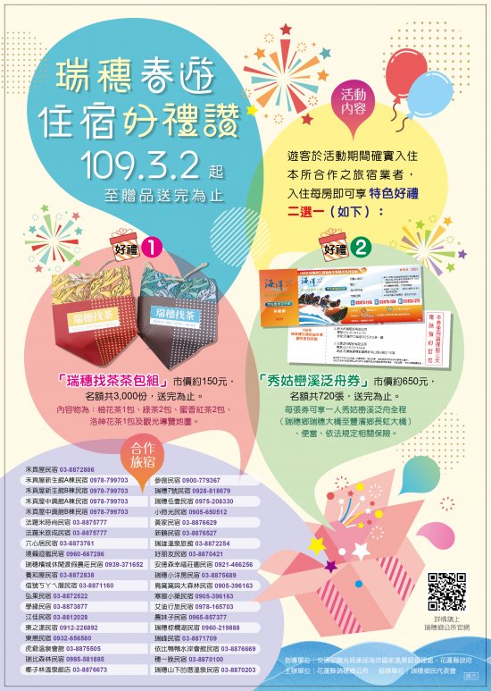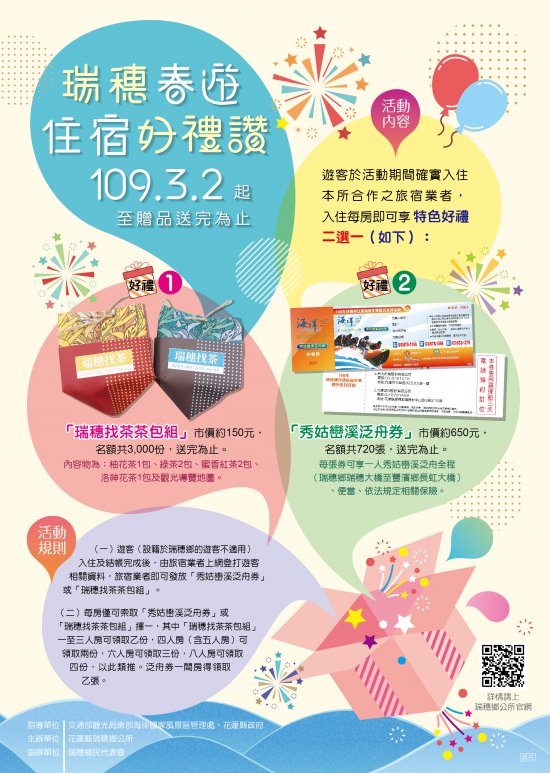 二、遊客於活動期間確實入住本所配合之旅宿業者,入住每房即可享有「瑞穗找茶茶包組」或「免費秀姑巒溪泛舟券」特色禮品好禮二選一,不限平假日,詳情請上本所官方網站查詢(https://www.juisui.gov.tw/cl.aspx?n=8053)。