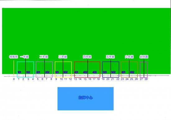 4.本次體育組為了讓各班明確了解安全避難場所班級定位,有擺放三角錐當作標記,每班學生請排一列並維持1公尺的社交防疫距離,老師們可以利用下課時間帶領學生依照疏散路線到集合地點的路程實際走一次。