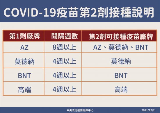 二、有關COVID-19第2劑疫苗接種間隔及廠牌,請參閱指揮中心公布之接種說明(附件):