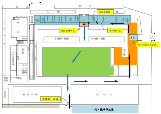 8. 當天家長或學生一律由東門進入校園汽機車請停放於東門停車場,為使施打流程更加流暢入校後動線及流程如下:敬請家長們配合謝謝~