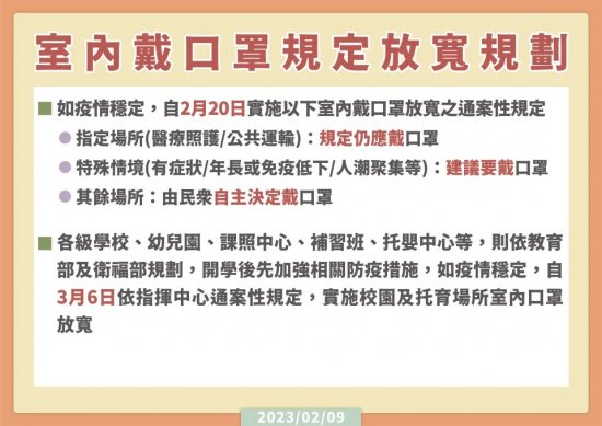 配合嚴重特殊傳染性肺炎中央流行疫情指揮中心(以下簡稱中央流行疫情指揮中心)今日宣布鬆綁室內口罩政策,教育部將自同年3月6日起,配合放寬各級學校校園室內戴口罩規定。
