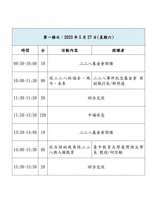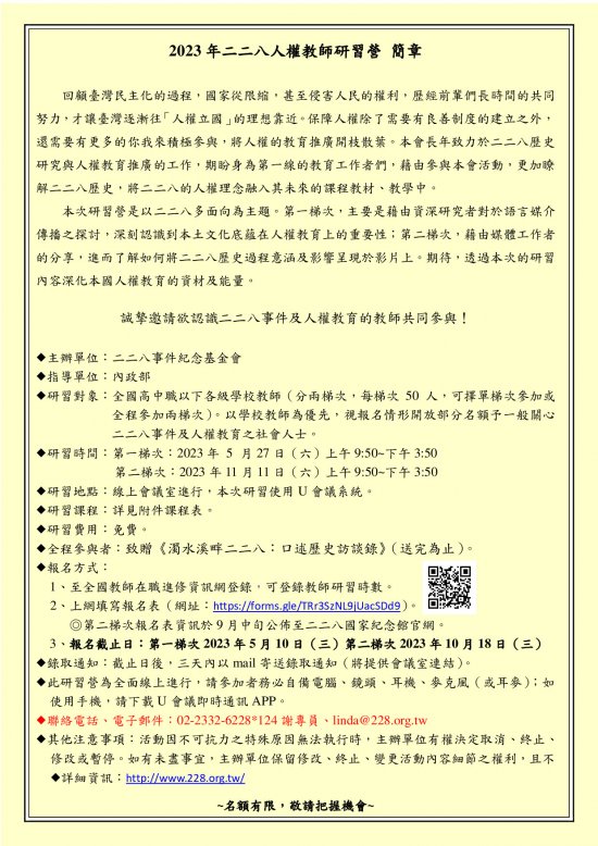 轉知附件活動訊息,鼓勵學校教師參與「2023年二二八人權教師研習營」活