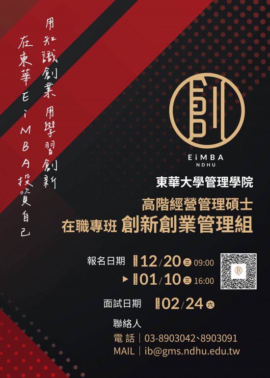 轉知國立東華大學管理學院高階經營管理碩士在職專班創新創業管理組113學年度碩士在職專班招生考試資訊。