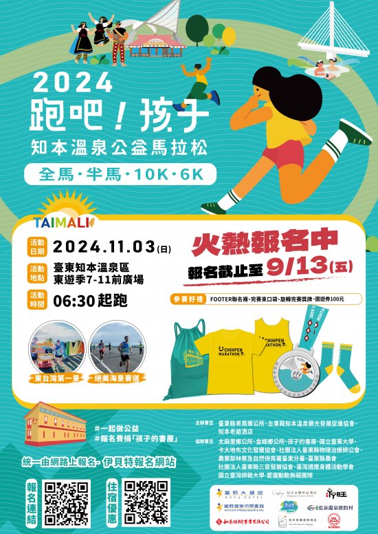 跑吧! 孩子2024 知本溫泉公益馬拉松, 活動日期:2024年11月3日(星期日)06:30起跑 活動地點:柬遊季7- 11前廣場 本次活動採綱路報名(請上伊貝特報名綱):https://bao-ming.com/eb/content/6059#28613