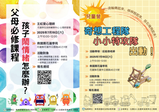 二、花蓮場活動訂於114年7月19日(六)上午10時至12時,假救國團花蓮學苑(花蓮縣花蓮市公園路40之11號)辦理, 活動包含家長講座與兒童營隊同步登場,歡迎踴躍報名參加。