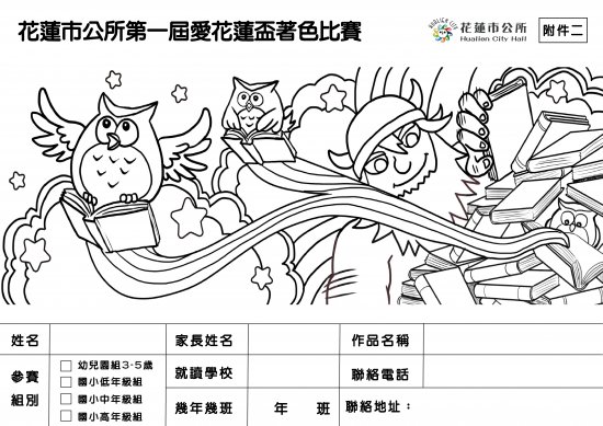 說明: 一、活動資訊如下: (一)收件日期:111年9月1日(四)至9月30日(五)。 (二)收件地點:花蓮市立圖書館兒童館(花蓮市進豐街115 號)。 (三)參加對象:幼兒園組、國小低年級組、國小中年級組、 國小高年級組。 (四)活動聯絡電話(03)8330214分機16,聯絡人:吳小姐。 二、檢送旨揭活動比賽辦法、著色圖稿、著作權同意書及海 報。