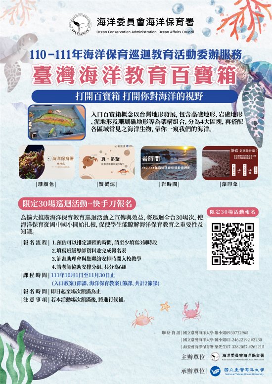 | 二、 | 為推廣海洋保育觀念,海洋委員會海洋保育署將辦理30場全國性海洋保育巡迴教育活動,透過活動使海洋保育從國中小開始扎根起,促進學生對海洋保育及環境認識,活動詳細資訊如下: |