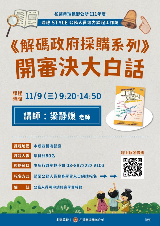 花蓮縣瑞穗鄉公所訂於111年11月9日(星期三)辦理 111 年「瑞穗 STYLE 公務人員培力課程工作坊 -解碼政府採購系列- 開審決大白話」研習,請各機關學校踴躍報名參加
