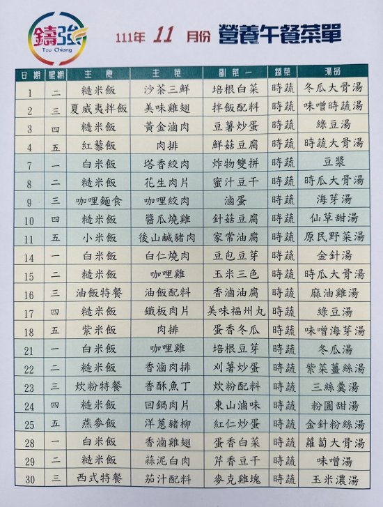 111學年度上學期11月營養午餐菜單上菜囉~~