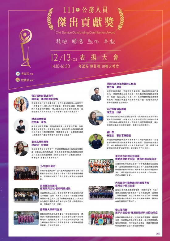 下載:檢送「111年公務人員傑出貢獻獎表揚大會」海報及得獎者具體事蹟簡介.pdf