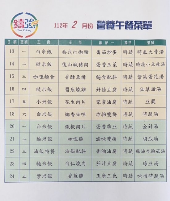 111學年度下學期2月營養午餐菜單上菜囉~~