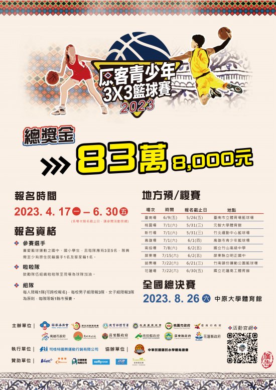 | 二、 | 由客家委員會發起,於109年舉辦全國首創的第1屆「原客青少年三對三籃球賽」,獲得各地原客子弟的熱烈迴響,今年賽事擴大辦理,特邀請原住民族委員會、教育部體育署、內政部移民署,以及8個直轄市、縣政府共同合辦,期許原、客青少年「以球會友,文化交流」,也藉此向原住民族致敬。 |