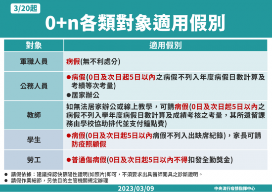 三、 教職員工生如篩檢陽性輕症或無症狀,仍依指揮中心112年3月9日建議進行「0+n自主健康管理」及假別(「0+n各類適用對象假別」圖卡)規定辦理。