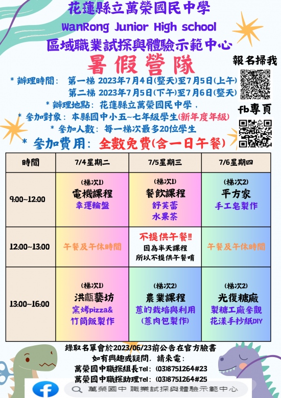 函轉本縣萬榮國民中學開設花蓮縣區域職業試探與體驗示範中心暑假營隊課程相關資料,鼓勵各校踴躍參加,並請核予帶隊教師公假登記,請查照。