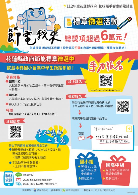 | 三、 | 本案採線上及紙本兩種方式報名,並分為國小組、國高中組進行競賽,將針對作品之傳達理念與節能意象、標章美感、結合花蓮元素程度、創意度、整體完整度作為評選項目,最優勝之作品則為本年度本縣自主節能標章並張貼於本縣符合條件之自主節能場所。 |