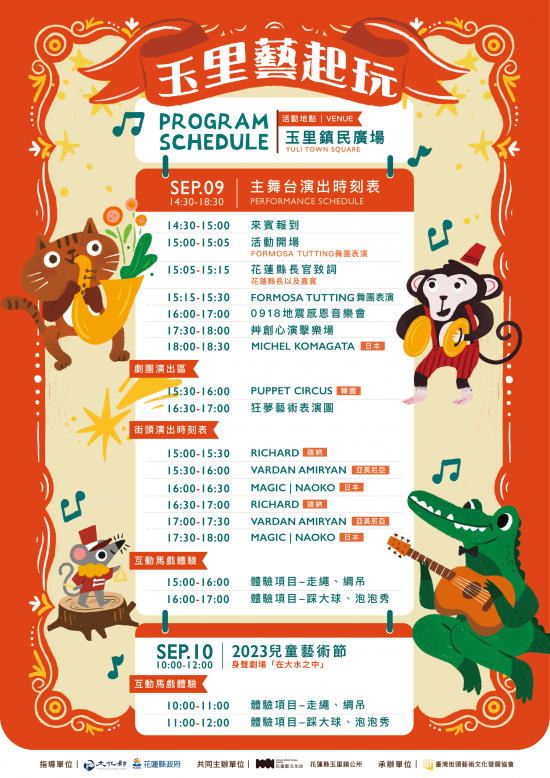 花蓮縣文化局與本所訂於112年9月9、10日於本鎮鎮民廣場(民權街與民國路交叉口)共同主辦「玉里藝起玩」,屆時將邀集享負盛名之街頭表演藝術者及身聲劇場演出,請貴校協助宣導並鼓勵學生參加,請查照。