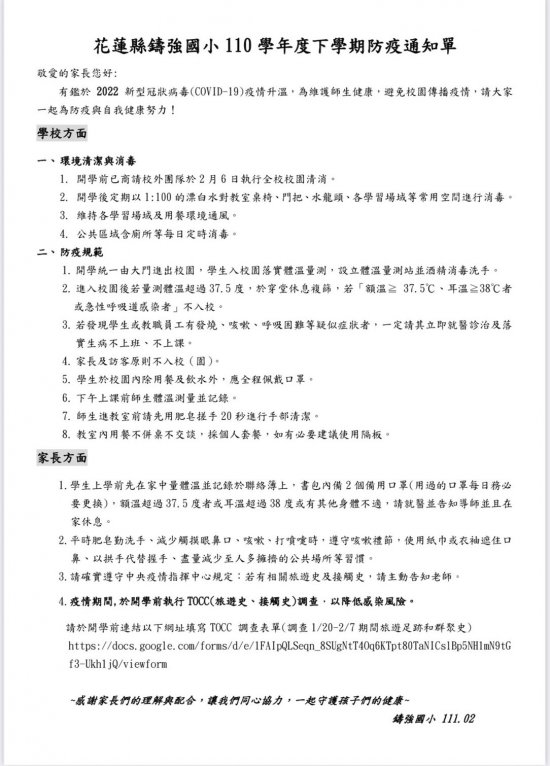 公告本校110年度下學期刊學前防疫通知