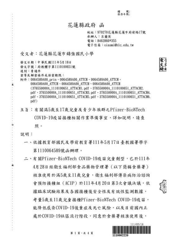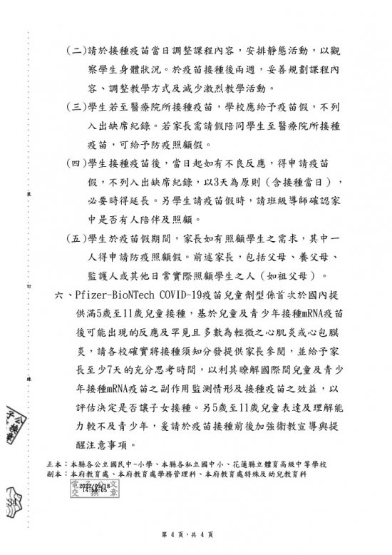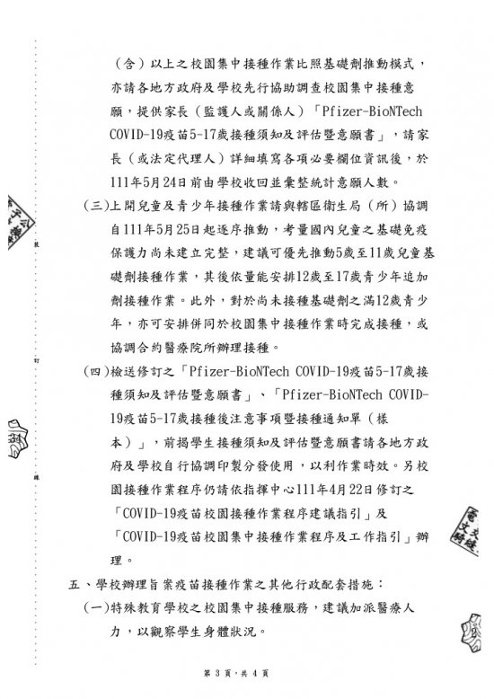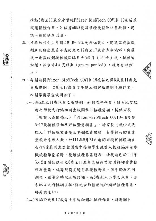 有關滿5歲至17歲兒童及青少年族群之Pfizer-BioNTech COVID-19疫苗接種相關作業準備事宜,詳如說明,請查照。