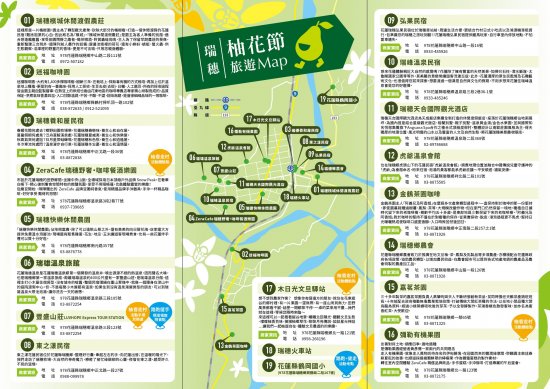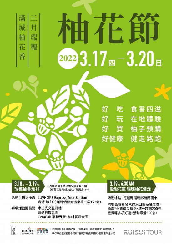 | 一、 | 瑞穗鄉坐擁花東縱谷壯闊景觀與豐富人文資源,鶴岡文旦更是全台遠近馳名。文旦柚於3月上旬開花,花期約20天,本次活動結合在地柚園,期讓所有參加者漫步在億萬朵的柚花海中,感受與享受瑞穗的天然美景。 |