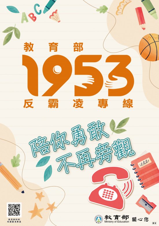 | 二、 | 教育部校園反霸凌專線電話「0800-200-885」已改碼為「1953」,自111年8月30日(星期二)起正式開通啟用。 |