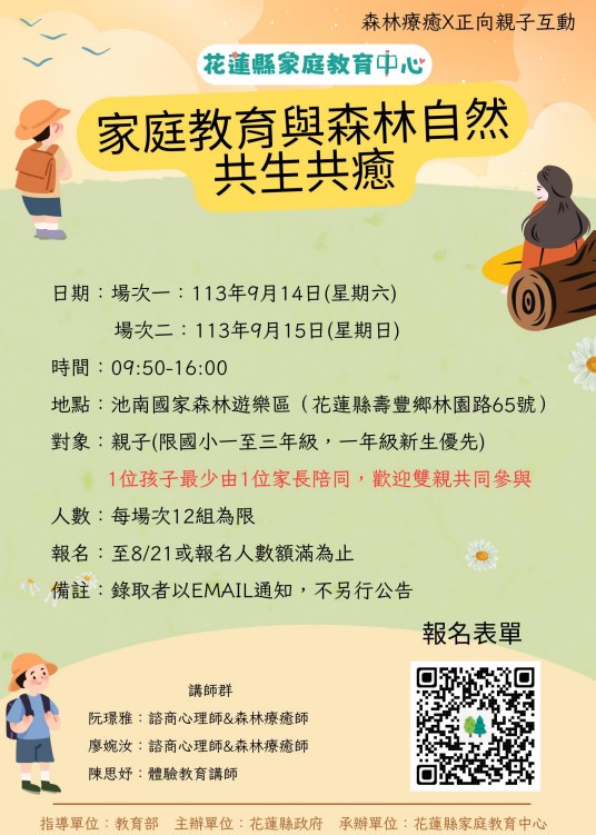 | 三、 | 旨揭課程擬訂於113年9月14日和9月15日上午9:40至下午16:00假池南國家森林遊樂區林業陳列館二樓多功能教室(花蓮縣壽豐鄉林園路65號)辦理,請鼓勵家庭成員共同參與。 |