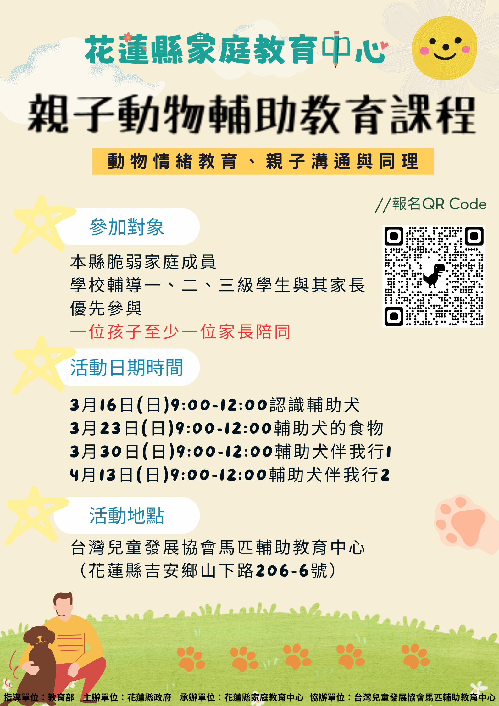 二、 為鼓勵本縣優先家庭成員透過與輔助動物互動,學習情緒表達與辨識情緒,練習表達內心感受與親子雙向溝通,本中心預定於114年3月16日、3月23日、3月30日和4月13日辦理相關課程(詳如附件)。