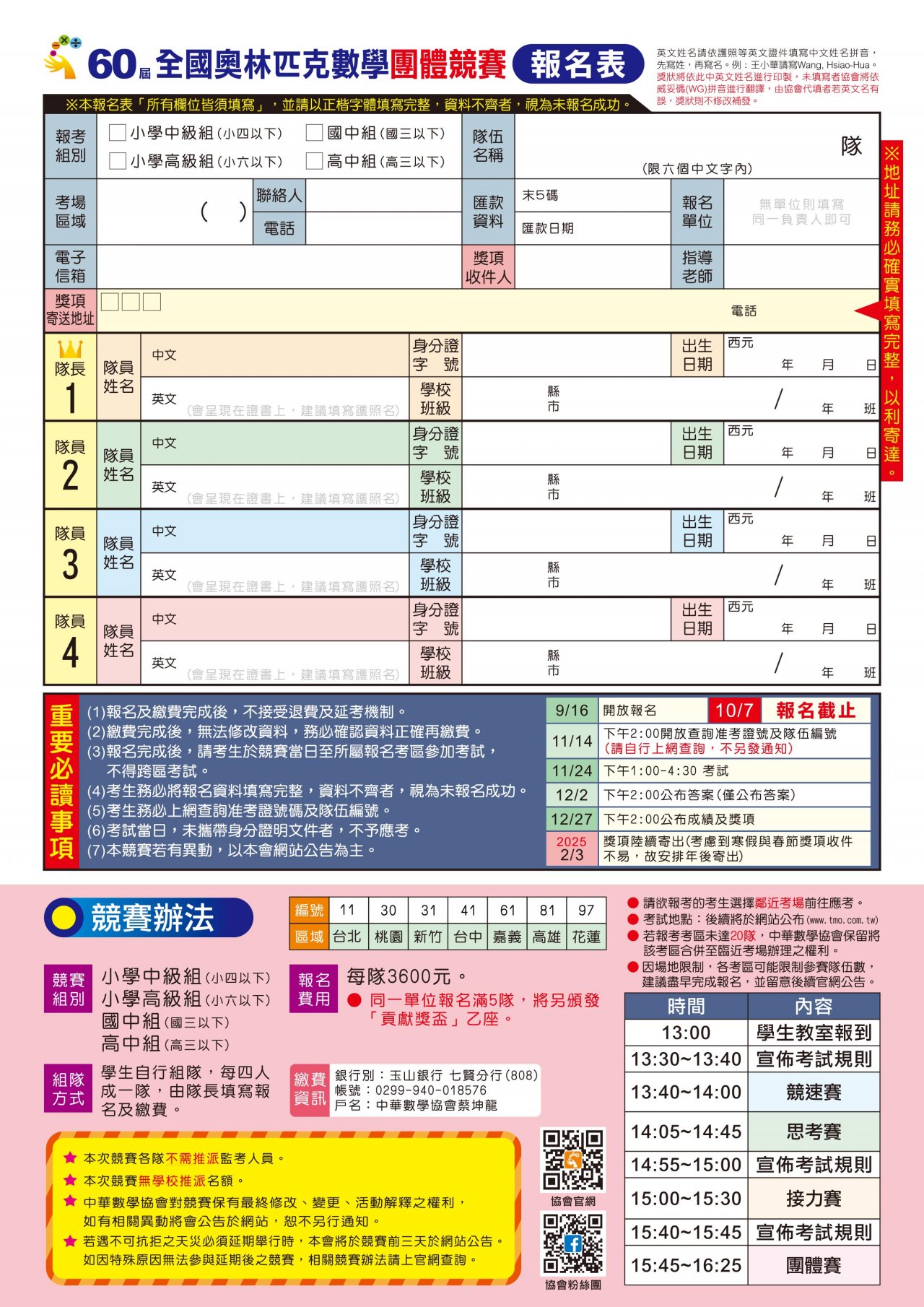 | 二、 | 檢附「第60屆全國奧林匹克數學團體競賽」競賽活動相關簡章,供 貴校參閱。競賽報名的起訖時間為113年9月16日至113年10月7日止。 |