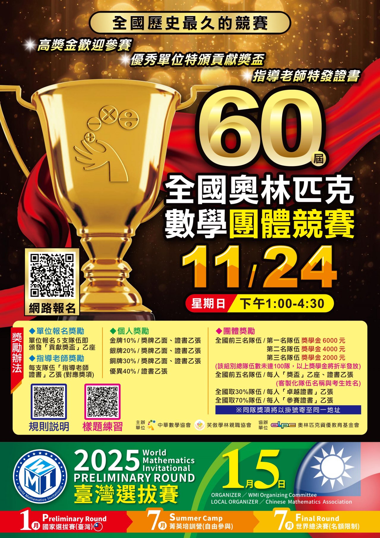 | 主旨: | 本會為推廣國小、國中至高中之數學教育,謹訂於113年11月24日(日)舉辦「第60屆全國奧林匹克數學團體競賽」,旨在培養學生對數學的興趣,為國家培育優秀人才。建請 貴校公告並鼓勵學生參加競賽,以提升數學教育,歡迎共襄盛舉。請 鑒核。 |