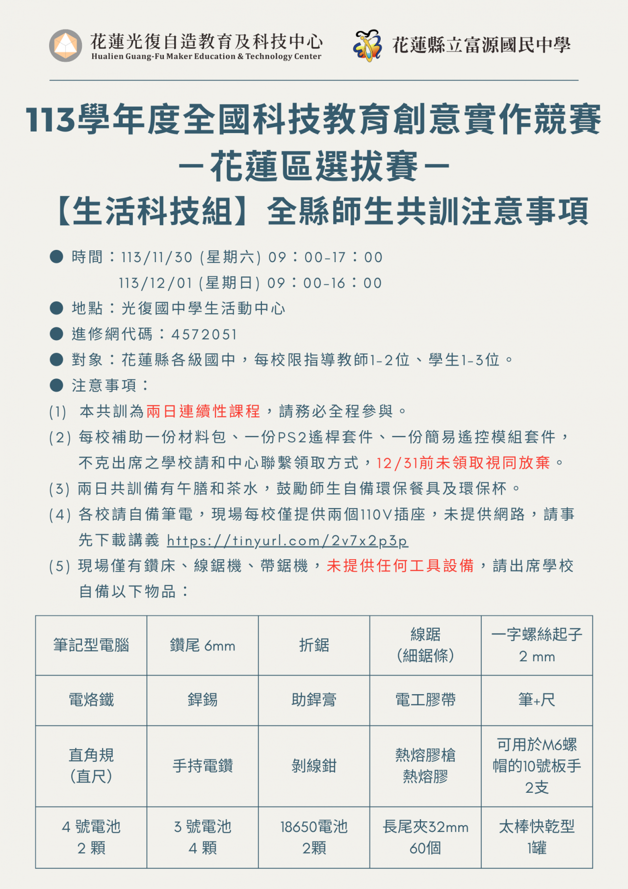 主旨: 本縣辦理113學年度全國科技教育創意實作競賽_ 花蓮區選拔賽,相關事項如說明,請查照。