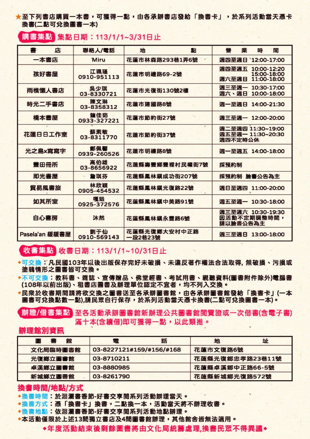 | 三、 | 相關資訊請參閱花蓮縣文化局圖書館粉專(花蓮縣文化局圖書館【洄瀾悅讀】):https://www.facebook.com/hua.library/。 |