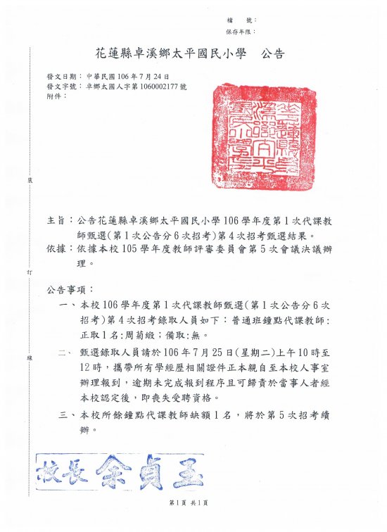 一、本校106學年度第1次代課教師甄選(第1次公告分6次招考)第4次招考錄取人員如下:普通班鐘點代課教師: 正取1名:周菊緞;備取:無。