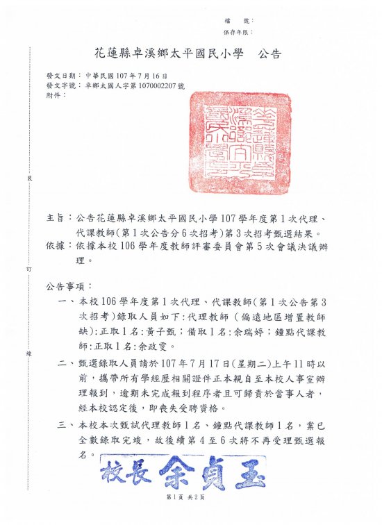 主旨:公告花蓮縣卓溪鄉太平國民小學107學年度 第1次代理、代課教師(第1次公告分6次招考)第3次招考甄選結果。