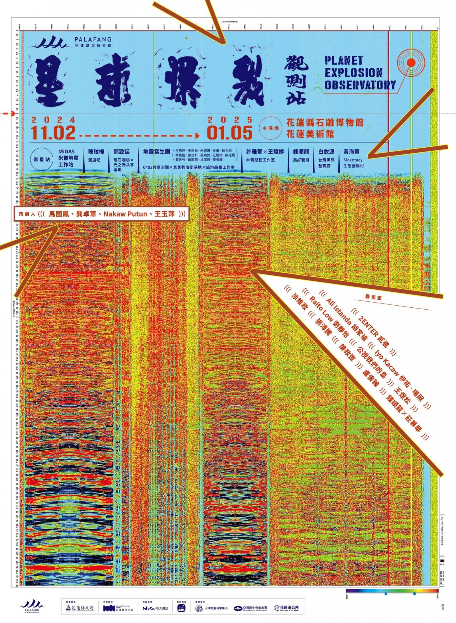 | 一、 | 由本局主辦第三屆「PALAFANG花蓮跳浪藝術節」於113年11月2日至114年1月5日盛大回歸。本屆藝術節由馬國鳳、龔卓軍、Nakaw Putun、王玉萍共同策展,以「星球爆裂觀測站」為主題,將在花蓮縣石雕博物館及花蓮美術館展出11組藝術家全新創作,並串連8個在地特色空間作為本屆藝術節的衛星站,帶來一系列精彩展覽及體驗活動。本次藝術節主題啟發自0403花蓮強震,探討人在震災後如何面對環境、理解災害及心靈自處,透過與Midas米崙地震觀測站科學團隊合作,也透過藝術創作的轉譯,將斷層破裂的觀測數據,延展到人與自然萬物在星球巨大震盪錯位後的關係重組與存在重逢,歡迎大家來體驗一場沉浸式美術課。 |