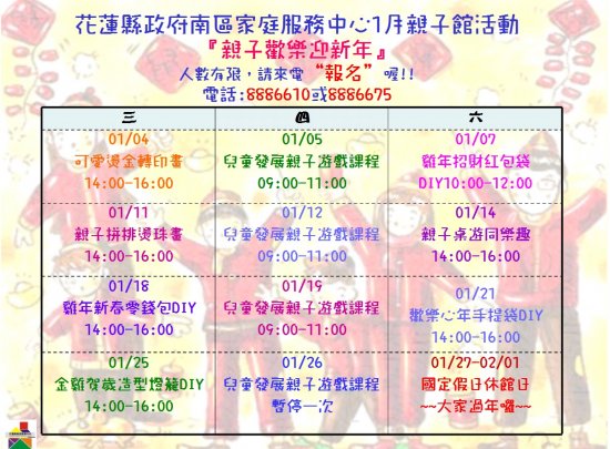 一、活動對象:本縣瑞穗鄉、玉里鎮、卓溪鄉、富里鄉親子家庭 二、活動地點:花蓮縣玉里鎮玉里國小永昌分校2樓(親子館) 三、活動時間:106年1月4日至1月25日 每週三、四、六 四、活動內容:如附件宣導DM 五、活動報名:03-8886610、8886675(名額有限~快快報名喔)