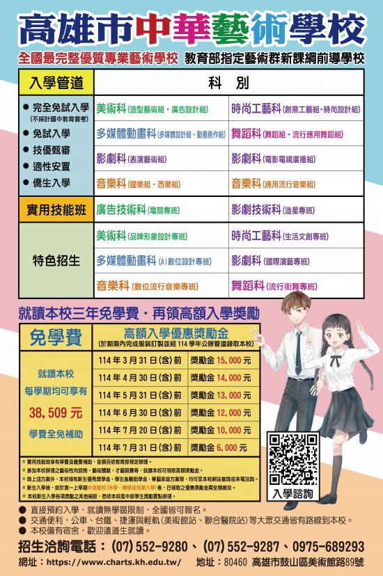 一、 114學年度日間部正規班美術科、多媒體動畫科、時尚工藝科、影劇科、音樂科及舞蹈科與實用技能班廣告技術科(電競專班)、影劇技術科(造星專班)熱烈招生中,入學管道及相關資訊詳見招生DM(如附件)。