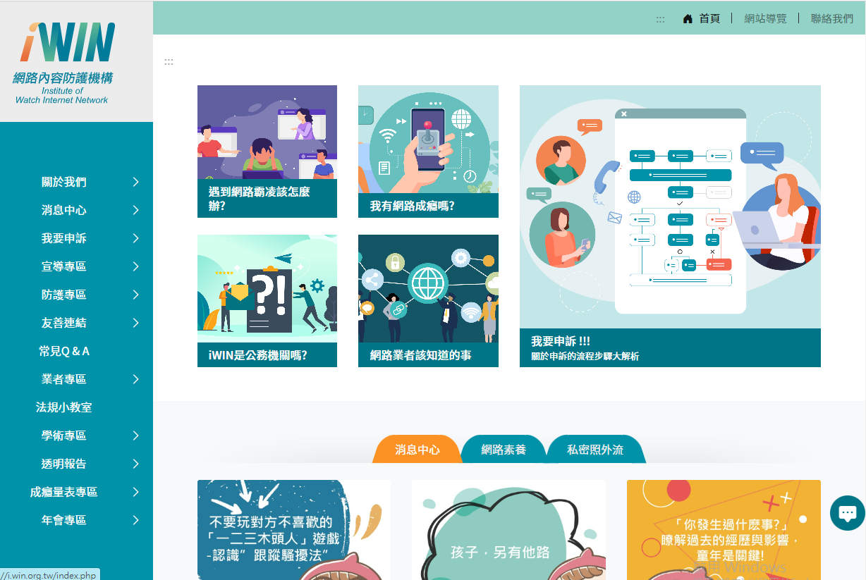 iWIN 網路內容防護機構(https://i.win.org.tw/index.php):宣導專區→「網路霸凌」、「私密照外流」及「網路素養」。