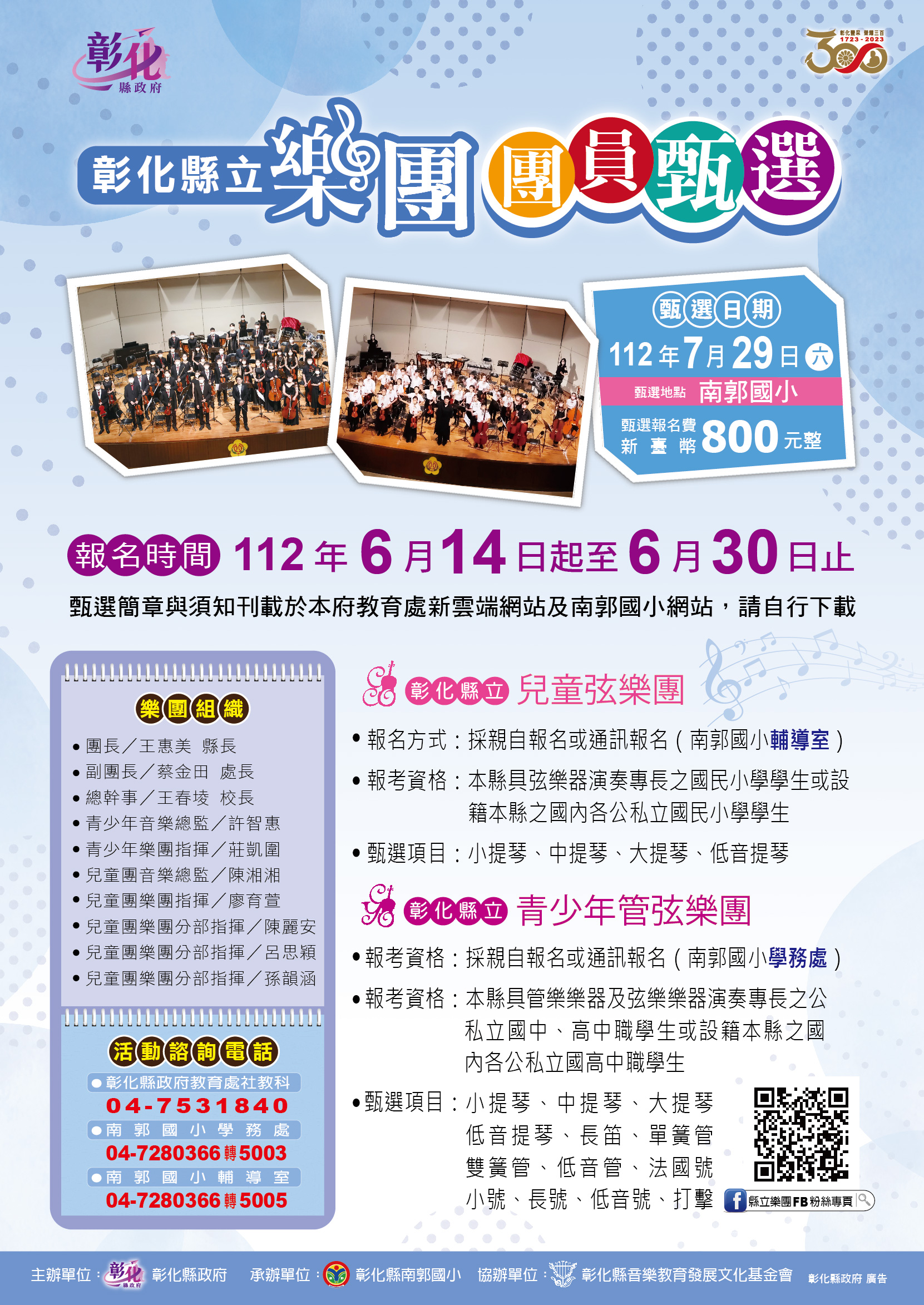 六、其他規定詳見甄選簡章及須知,亦可至彰化縣政府教育處新雲端網站下載(網址路徑為 https://www.newboe.chc.edu.tw/業務專區/檔案下載/04_社教科/彰化縣立青少年管弦樂團暨兒童弦樂團團員甄選簡章/112 學年度項下)。