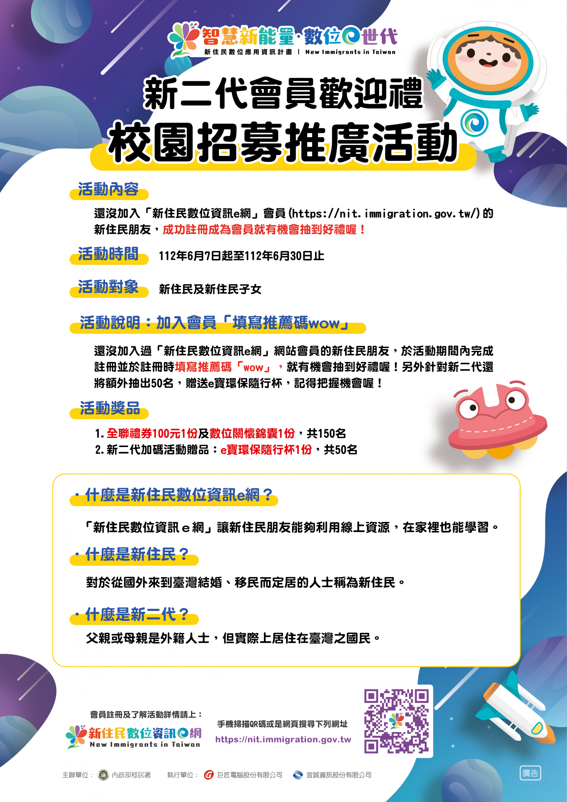 三、為廣邀校園之新住民及新住民子女踴躍參與學習,本署特舉辦「新二代會員歡迎禮~校園招募推廣活動」新會員註冊推廣活動,活動期間自 112 年 6 月 7 日至 112 年 6 月 30 日止,活動詳情請參閱新住民數位資訊 e 網公布欄。