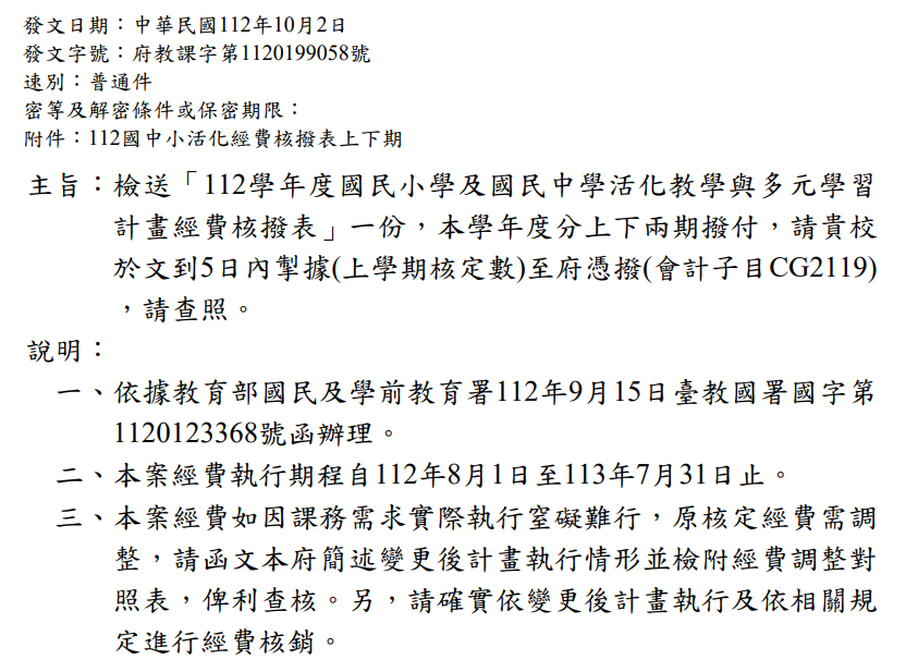 有關112學年度國民小學及國民中學活化教學與多元學習計畫請各校在使用經費時以會計子目CG2119作業。