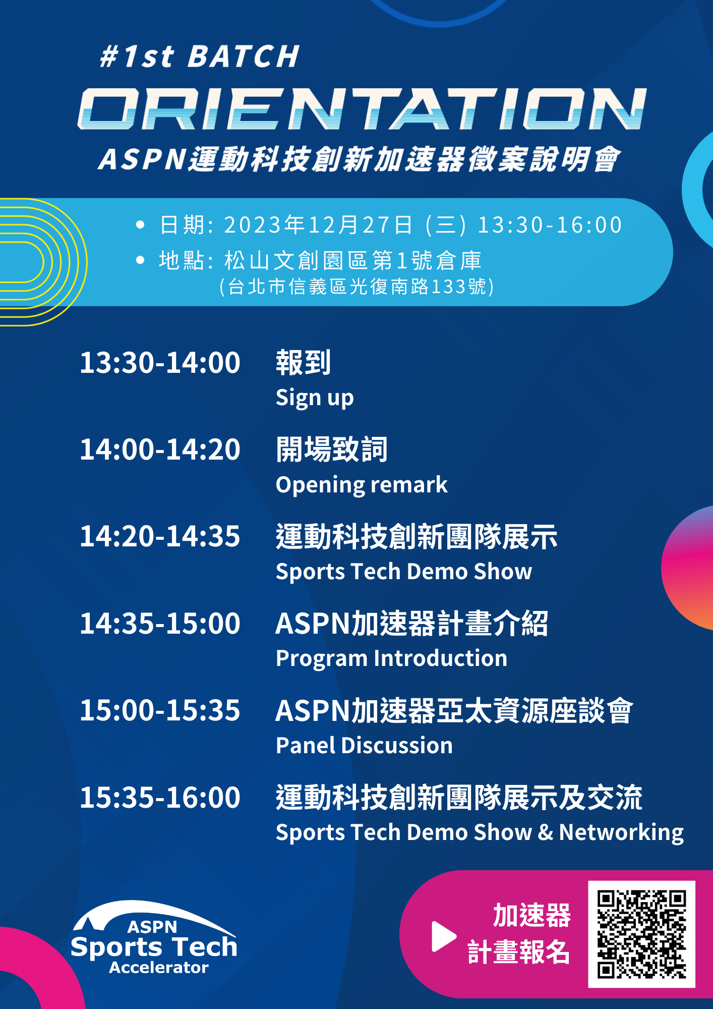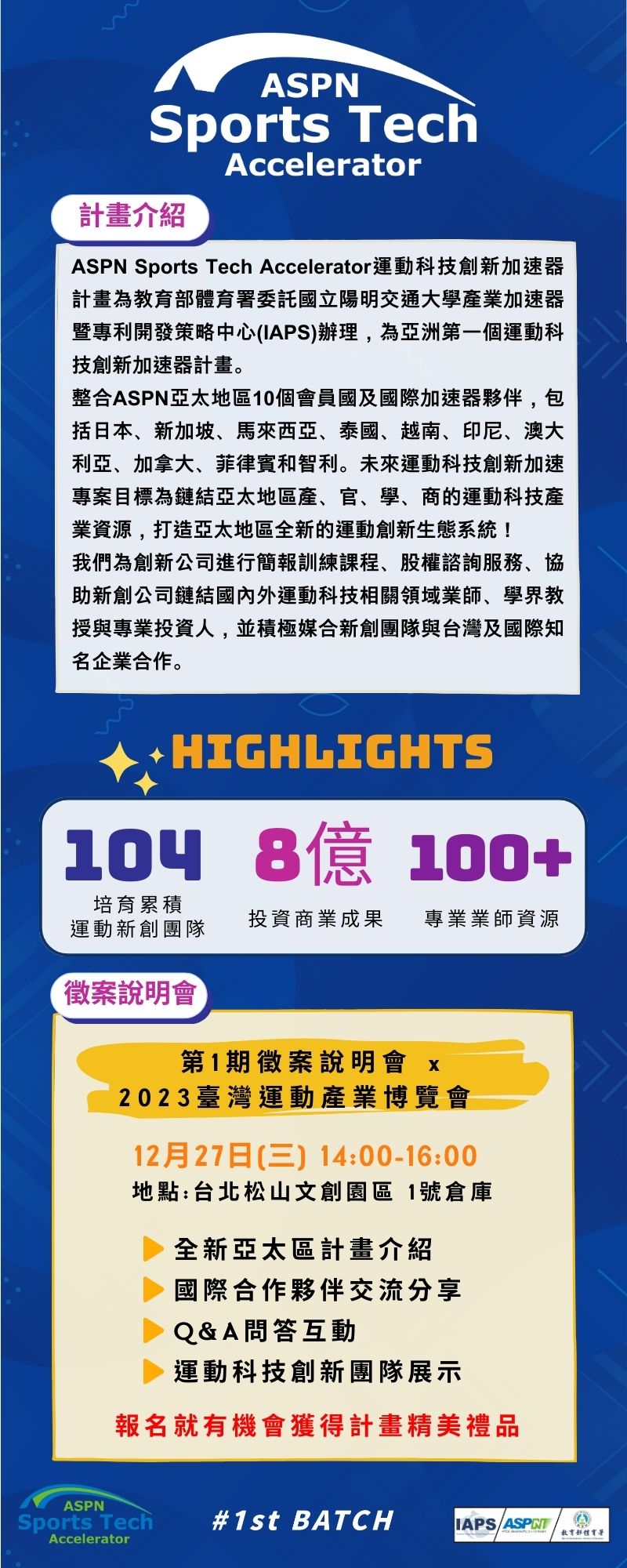 三、旨揭計畫為遴選 8 到 15 個運動創新團隊參加,無需繳交任何費用,即可獲得國內外業師輔導、知名運動品牌企業、創投專業經理人媒合等資源,並鏈結國際運動創新平臺,為運動創新帶來更多可能性。計畫報名日期:即日起至 112 年 12 月 29 日止。計畫報名網址: https://bit.ly/ASPNLandingPage