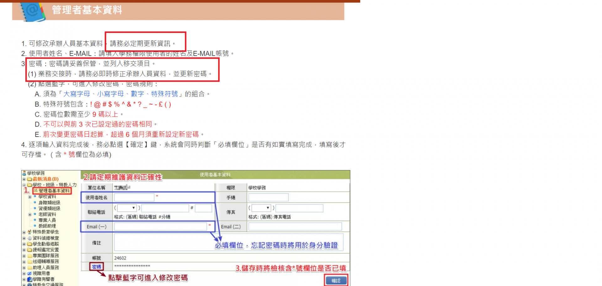 • 請檢視特殊教育學生的基本資料、學習現況、教育需求等項目,並確保各項資料無誤漏。