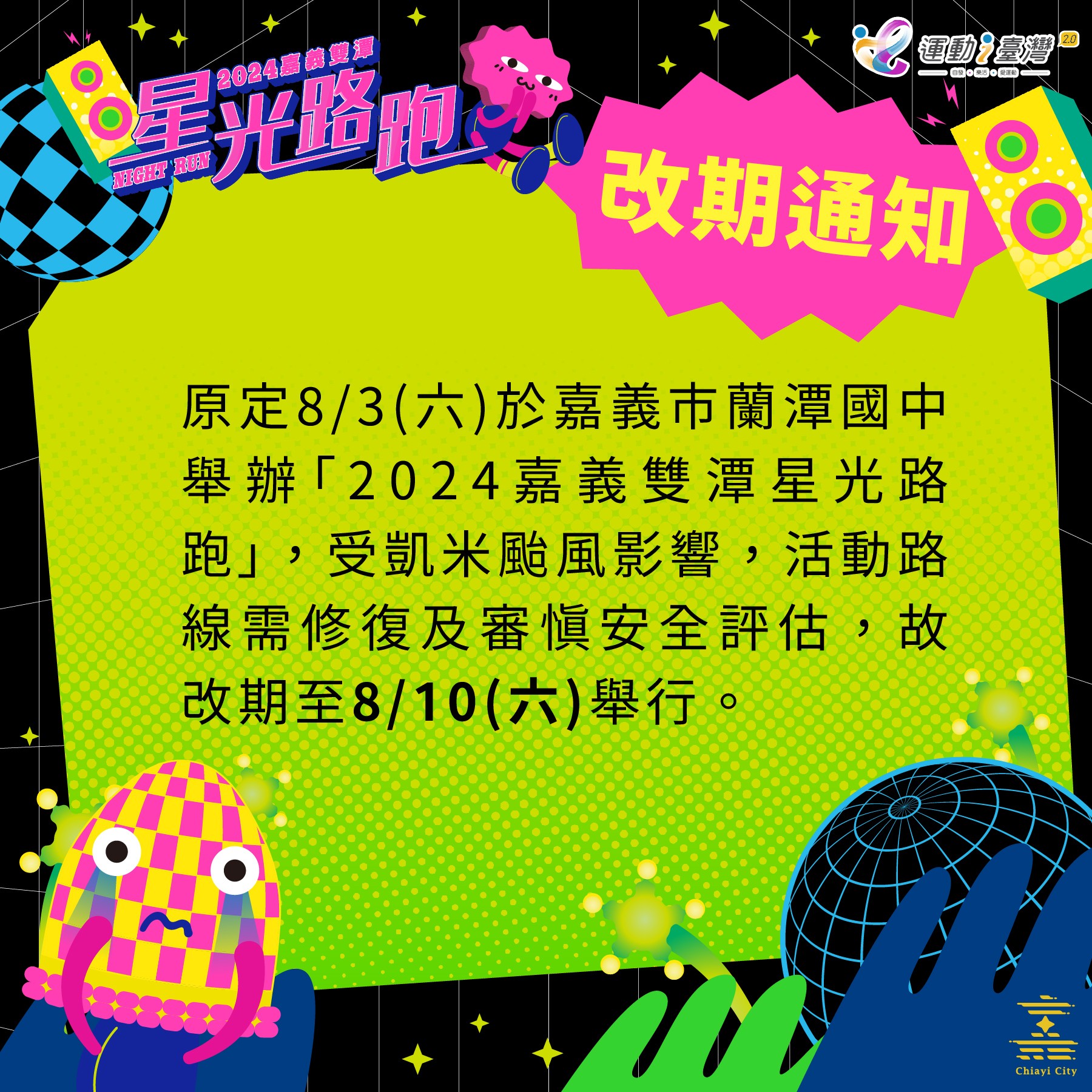 一、依據嘉義市政府 113 年 8 月 1 日府教體字第 1130951213 號函辦理。 二、活動時間:原訂 113 年 8 月 3 日(週六)改期至 113 年 8 月 10 日(週六)下午 2 時至晚上 9 時。 三、活動地點:嘉義市立蘭潭國民中學。
