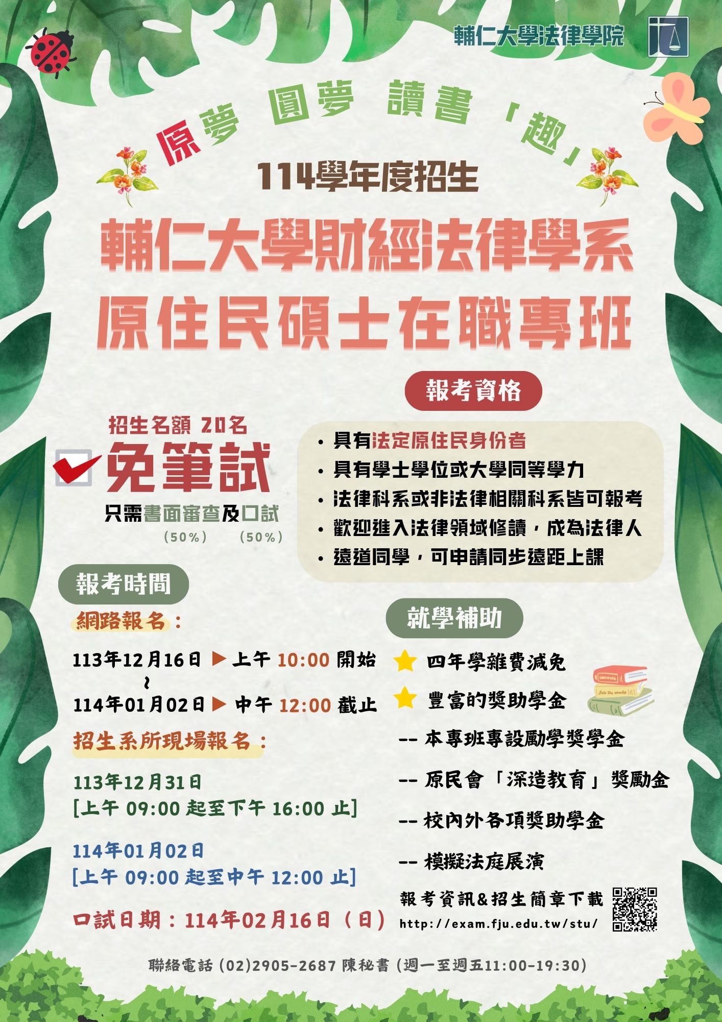 五、其他相關資訊請參見簡章(招生資訊平台: https://exam.fju.edu.tw/)。