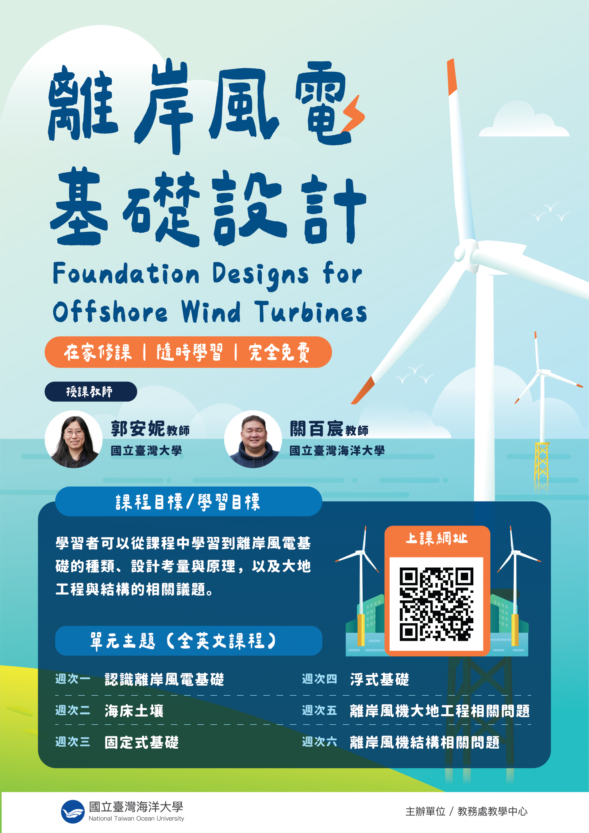 (二)課程內容:課程涵蓋離岸風電基礎理論、海床土壤特性、固定式與浮式基礎設計,以及離岸風機大地工程及結構相關問題。