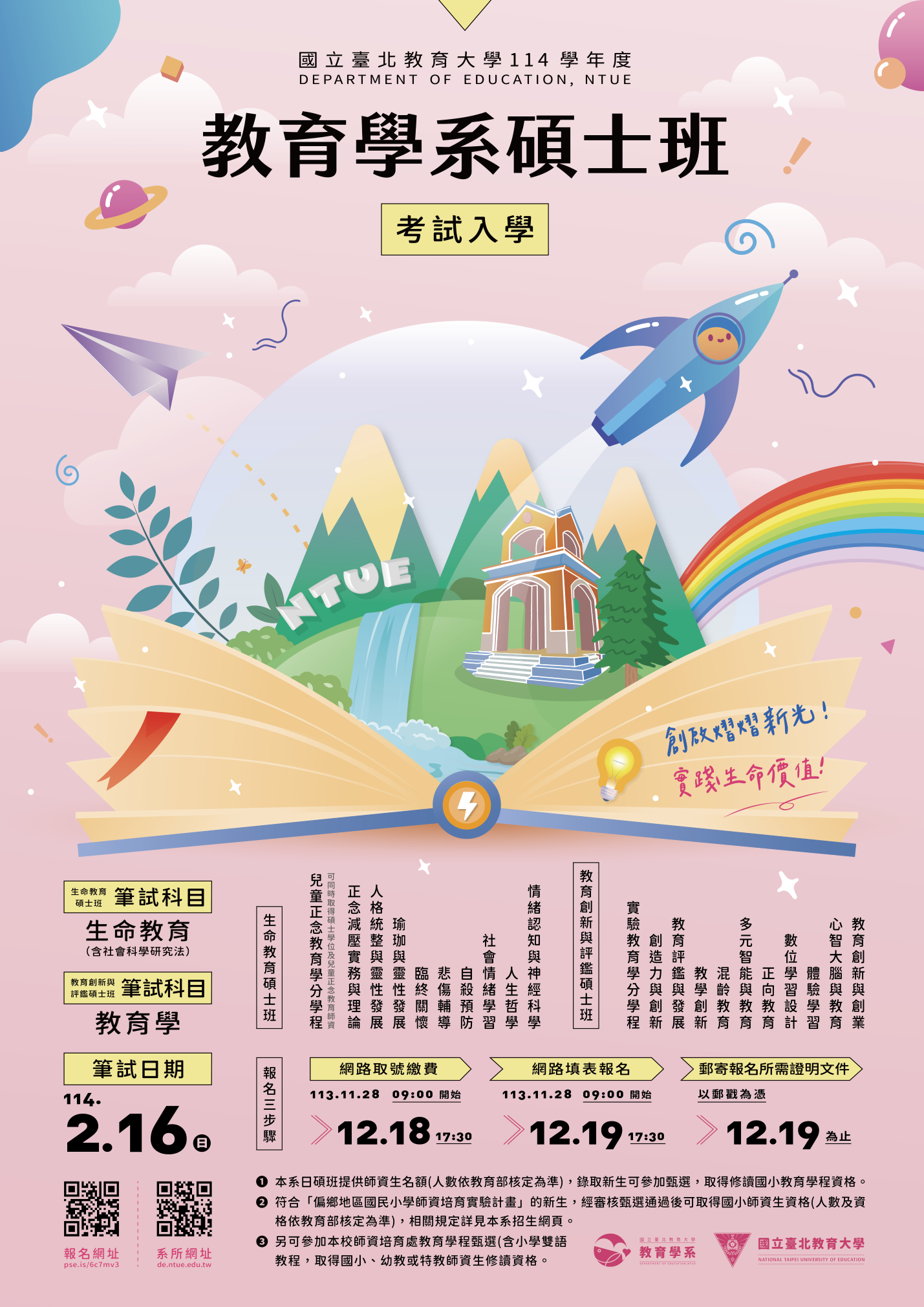 國立臺北教育大學教育學系「教育創新與評鑑碩士班」、「生命教育碩士班」114學年度考試入學招生,敬請踴躍報考。